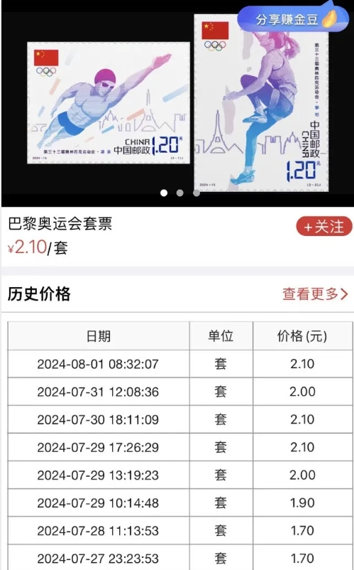 《巴黎奥运会》邮票行情反弹→ 日期:2024-08-02 来源:集邮者 集邮者讯,近期巴黎奥运会邮票反弹明显,大宗市场目前散票成交价2.1-2.3元,撕口收购价在2.3元,近乎面值了。但客观来讲,体育题材都是时效性的,一旦奥运会结束,行情还是有一定的下跌空间。这也是体育题材一直是冷门题材的原因之一。尤其非我国举办的运动会。因此行情变化还是有波动的。
