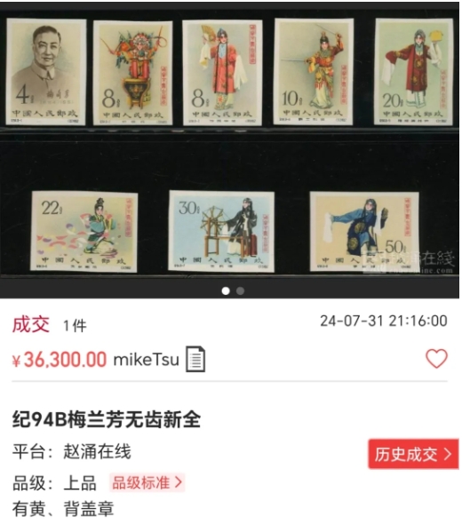 其实,7月份的这件拍品30000多成交价格算低了,今年年初2024年1月16日,一枚上品纪94B梅兰芳无齿票,尽管部分票面略显黄色,但个别仍完好如初,以56,100元高价成交。同样的在2024年2月29日,一套纪94B无齿带宽边双连,成交价高达85,800元。