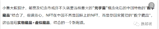 因为我国禁止数字货币,像比特币、以太坊的NFT邮票不可能发行。而之前邮总与第三方区块链数字藏品平台合作的品种,没有公开限量数据,没有更多的盲盒效果,没有与纪特邮票绑定。当时小集也写过一篇文章邮票数字藏品,缺乏创新思维,只做跟风者 让人唏嘘...。如同集邮周一样,照猫画虎而以...