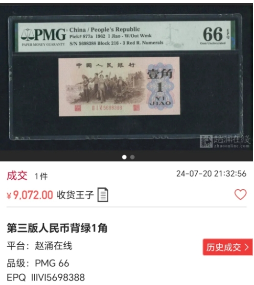 三版人民币中有一枚一角币,叫作背绿一角,目前很值钱,前几天一枚背绿一角评分为66分的拍出了9072元,具体见图。