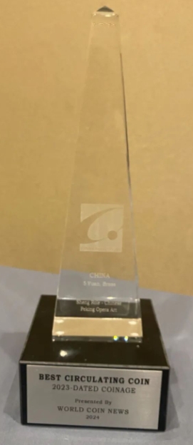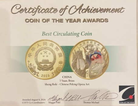 2024年8月9日凌晨(美国芝加哥时间8月8日中午),第41届世界硬币大奖评选结果公布并颁奖。中国京剧艺术(生)普通纪念币荣获“最佳流通币”大奖。世界硬币大奖(克劳斯)是世界上规格最高、影响范围最大的硬币评选活动,是硬币领域最高荣誉。本次获奖充分展现了我国日益发展的、与国家实力相匹配的钱币设计水平、工艺技术与制造能力。