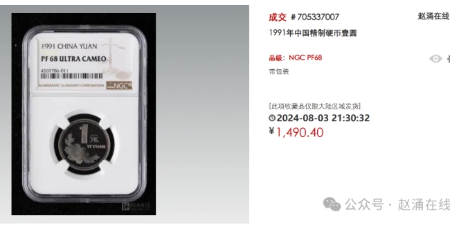 近日在赵涌在线成交的这枚精制币,1991年中国精制硬币壹圆,如今拍出了1490.4元的价格,实在是“身价暴涨”。