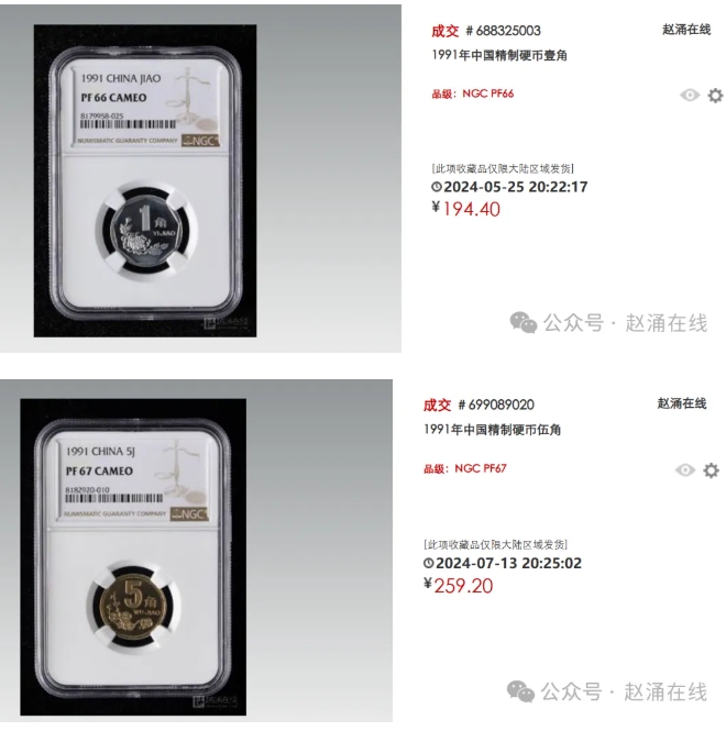 赵涌在线近几个月也有1991年精制壹角、精制伍角出现成交,也都有超过币值百倍乃至千倍的价格。