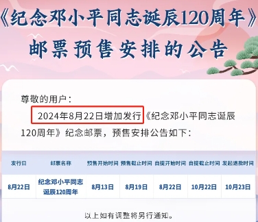 集邮者讯,最近也收到不少邮友关于《纪念邓小平同志诞辰120周年》邮票为何是增加发行,而不是计划发行?