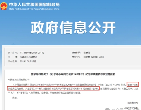 其实根据国家邮政局的《纪念邓小平同志诞辰120周年》纪念邮票的批复内容,就可以看到:根据中央有关纪念活动安排决定发行,而其实所有的纪特邮票发行审批都是国家局安排的...
