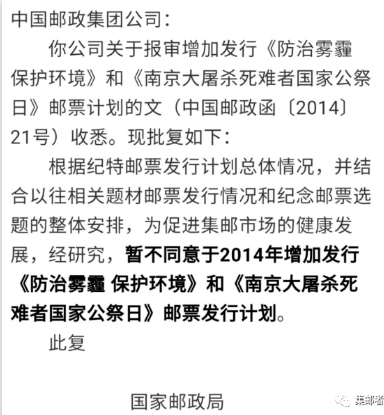 就如曾在2014年中国邮政提报申请增加发行的《死难者国家公祭日》这套邮票,国家邮政局最终没有通过审批。