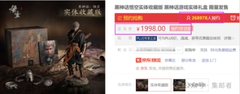在6月8日游科京东旗舰店,早就预售了《黑神话悟空》实物收藏版。分2个版本:一是实体豪华版预售价820元,限量发行2万套,二是实体收藏版预售价1998元,限量发行1万套。