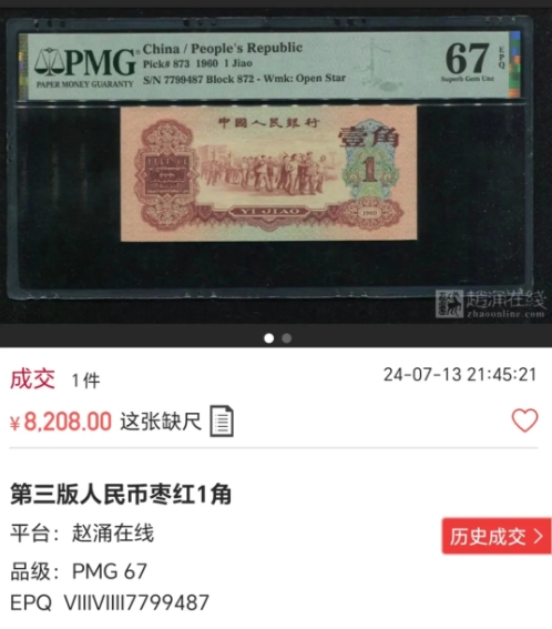 前几天,一张PMG评分为67分的三版人民币枣红一角,经过多轮激烈竞拍,最终以8208元成交!具体见图: