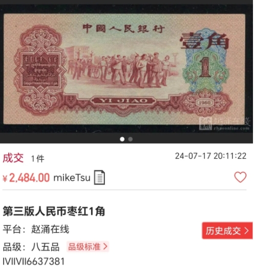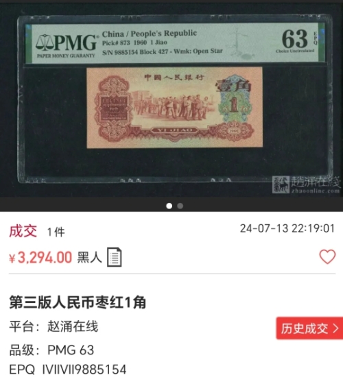 再比如,下面这枚评分在63分的枣红一角,成交价就达到了3294元!