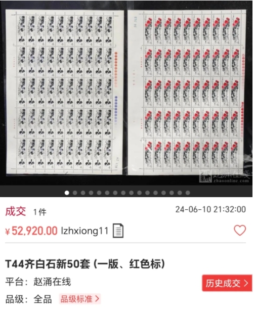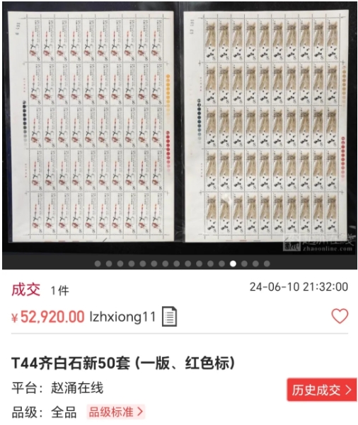 6月份的时候,看到赵涌平台上拍出了整版的齐白石作品选邮票,还是全品的,真的是好看又震撼,成交价也直接是心跳拉满,直接以52920元一版成交,一版是50套,也就是说相当于一套1000多块,真的是直呼厉害啊!