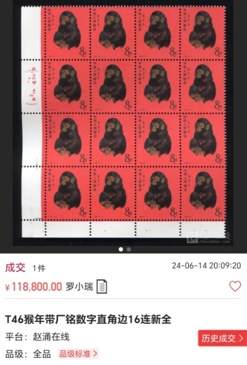 但是,到了现在9月份,我们再看看金猴价格。带数字直角边四方连拍出24840元,折合单枚6000多点。