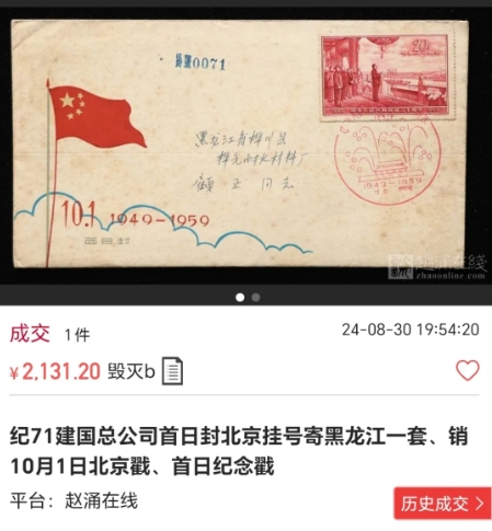 前几天,就看到赵涌平台上拍出了一封纪71建国总公司首日封北京挂号寄黑龙江一套、销10月1日北京戳、首日纪念戳,最终成交价在2131元!