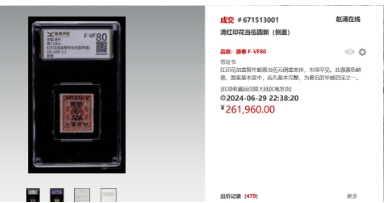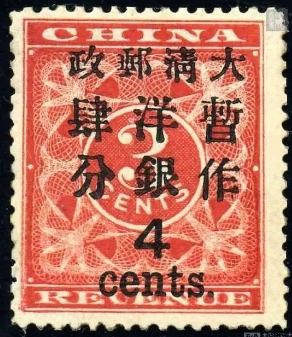 四宝中的稀世珍品。红印花加盖“当伍圆”邮票的印制数量大约有2万枚,但由于票的面额高,之间存世总共约300枚,其中当伍圆倒盖票只有70枚。2024年6月29日,一枚清红印花当伍圆倒盖票在赵涌在线平台上以近26.2万元人民币的高价成交,源泰评级分数为F-VF80分,品相不凡,更显示了其非凡的市场价值。