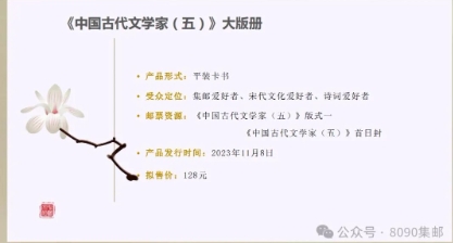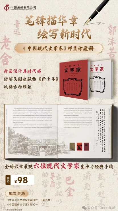 《中国现代文学家》邮票版票册揭晓 日期:2024-09-14 来源:8090集邮 中国邮政计划将在2024年10月15日发行《中国现代文学家》纪念邮票一套六枚,拟展现鲁迅、郭沫若、茅盾、巴金、老舍和曹禺六位文坛巨匠。随着发行时间临近,该套邮票的版票册正式揭晓: 对比去年发行的《中国古代文学家(五)》邮票版票册的售价: 各位感觉是版票枚数浓缩了,还是... ...