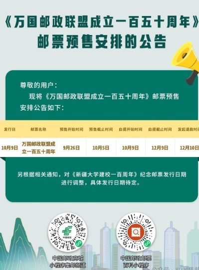 “万国邮联”邮票【自提】销售时间确定,将在9月26日开售 日期:2024-09-21 作为各国和地区商定国际邮政事务的政府间国际组织组织,万国邮政联盟将在今年迎来成立一百五十年,各国和地区邮政都会发行纪念邮票以致纪念。 随着发行时间临近,中国邮政公布该套邮票【自提】销售时间: 中国邮政定于2024年10月9日发行《万国邮政联盟成立一百五十周年》纪念邮票一套1枚: 随着这套邮票发行时间临近,其【自提】销售时间确定,并正式公布: 对这套邮票有兴趣的,可以参合参合...