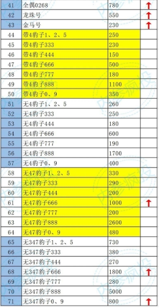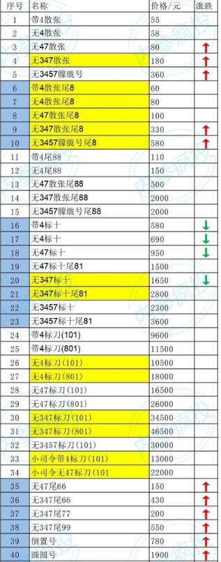 下图表显示,不少品种涨跌互现,多数品种横盘震荡。(注:部分号码市场价格采集比较困难,价格准确度可能少低,大家只做一个参考)