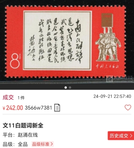 文11白题词在集邮市场上还是比较知名的。近期,一枚白题词全品票拍出了242元,具体见图。
