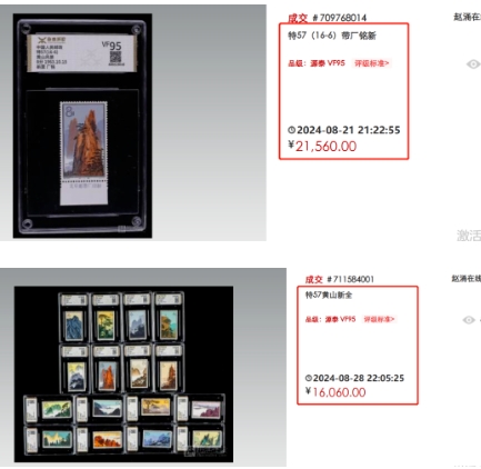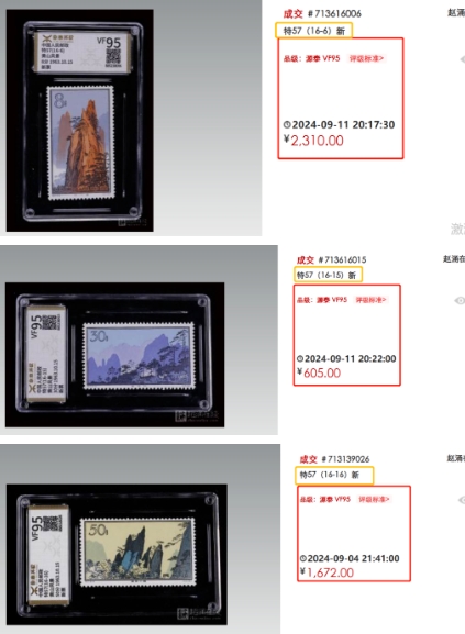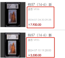还有更为珍罕的,带厂铭或色标的筋票,上个月赵涌在线成交一枚带厂铭源泰VF95分的(16-6)邮票,它的价格已经足够拿下一整套同样95分的全套黄山了。