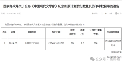 集邮者讯,国家邮政局刚刚公布了《中国现代文学家》邮票的发行量,600万套,新邮发行量持续减少中!