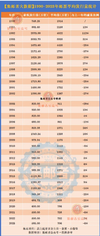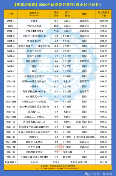 而2024年已公布的23套纪特邮票平均发行量已来到631万了,而2023年纪特邮票平均发行量还在706万套。预计今年减量幅度可期!