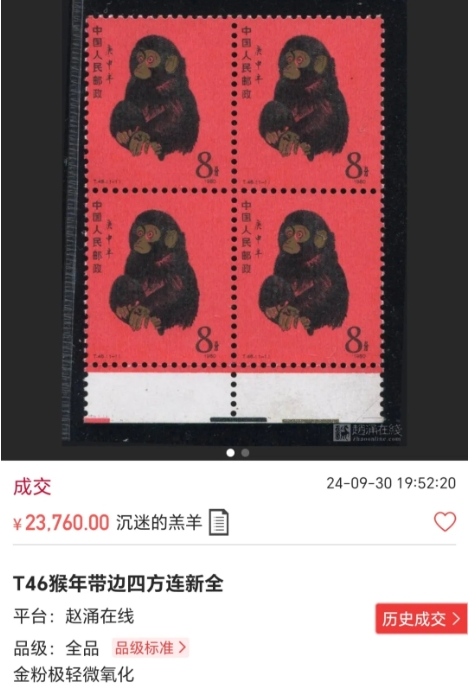 一轮金猴自从跌落神坛后,价格也是一路下滑。前几天,一轮金猴四方连还带边纸,竟然只拍出了23760元,折合单枚也就6000不到,这显然已经是低价了。具体见图吧