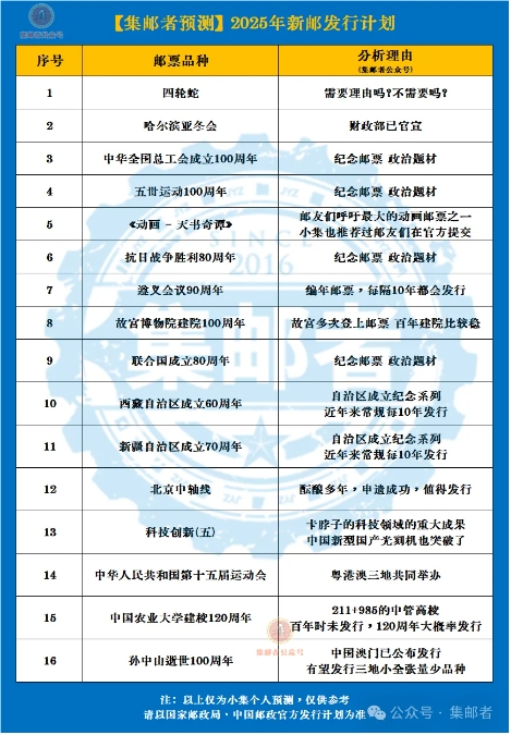 以上仅为小集个人分析和想法,2025年邮票发行题材最终还请以国家邮政局及中国邮政官方公告为准!