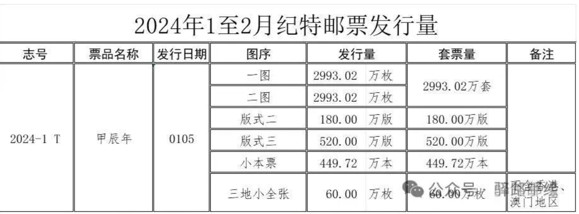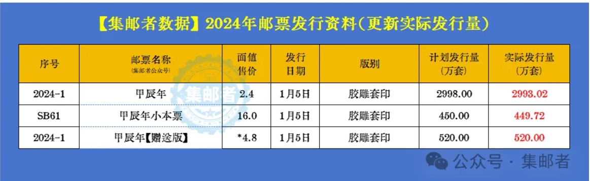 2024年1至2月纪特邮票「实际发行量」公布 日期:2024-10-18 集邮者讯,2024年1至2月纪特邮票「实际发行量」公布,其实只有四轮龙生肖邮票! 可好以看到,像小版,赠送版及量少品种的实际发行量=计划发行量,只有预定的年票,发行量才会减少。 集邮者Tips 因此通过这些数据再次总结下:中国邮政公示的计划发行量=印制量(最大发行量),实际发行量=印制量-零售票退缴的邮票!