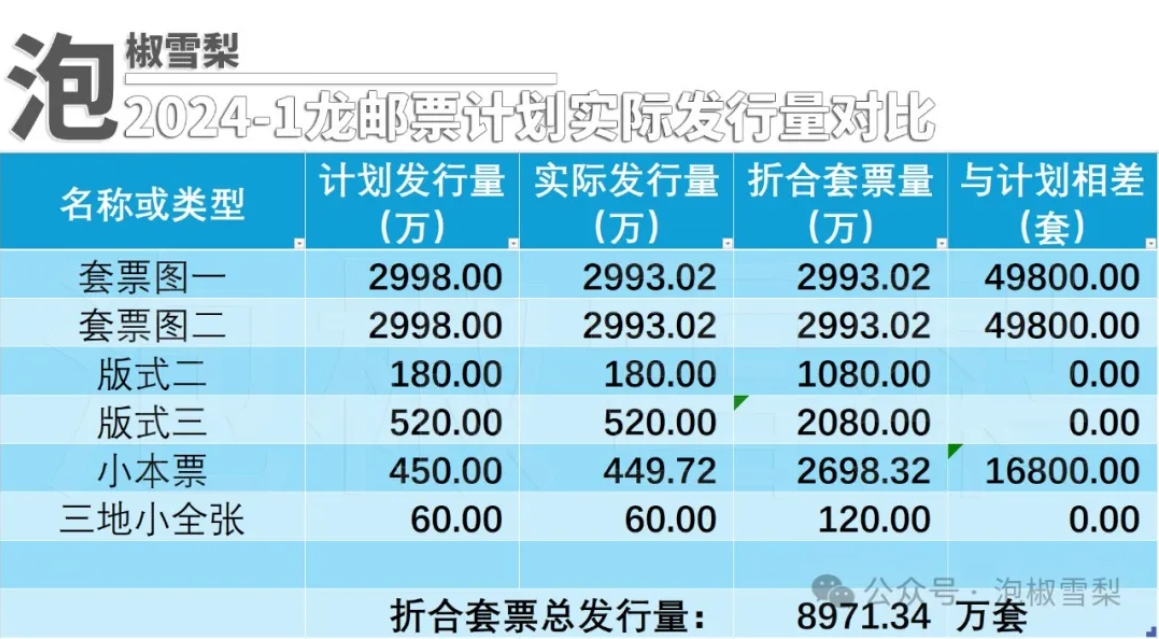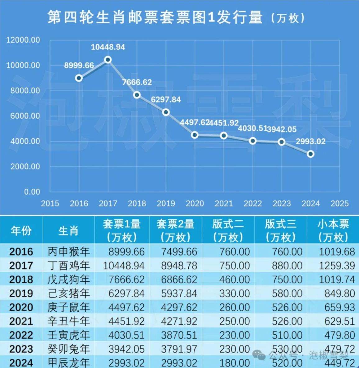 其中套票2993.02万套、版式二180万版、版式三520万版、小本票449.72万本、三地小全张60万张。与2023年12月11日公布的计划发行量相比,实际发行量略有降低,现将两者数据对比如下:其中套票比计划减少了49800套,小本票减少了2800本,其余均与计划发行量保持一致。第四轮生肖邮票至今已发行9套,首枚2016年猴票发行量8999万枚,最高发行量则是2017年生肖鸡,达到了1亿枚,之后便是连续七年的减量,到了今年的四轮龙只发行了2993.02万枚,是四轮鸡发行量的28%。