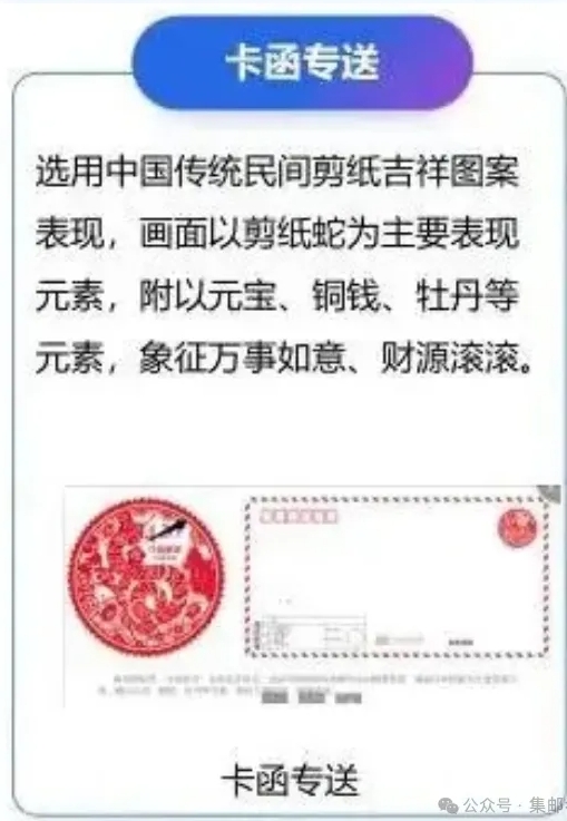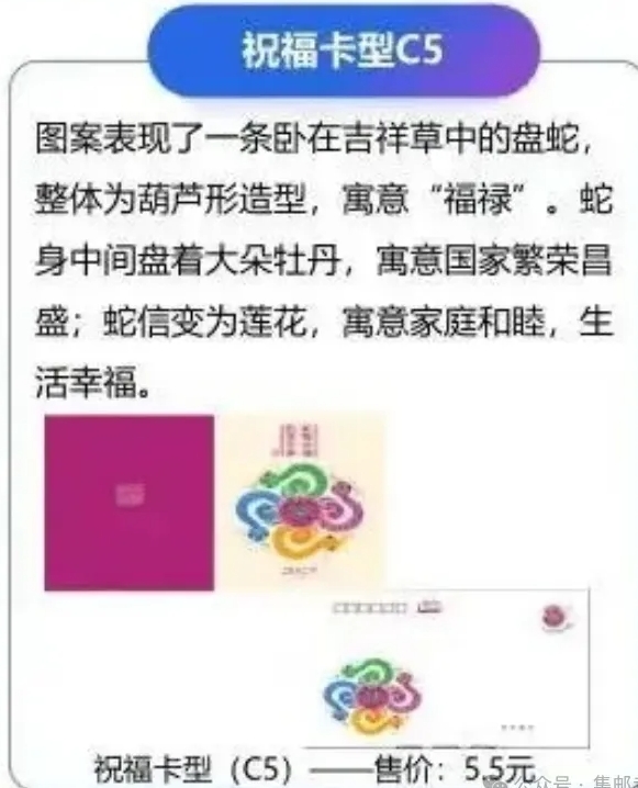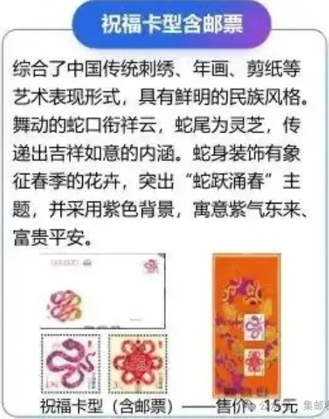 2025蛇年贺年邮票,谍照流出,3元又换新图了→ 日期:2024-10-27 来源:集邮者 集邮者讯,最近邮政2025年贺年邮票征订的PPT流出,其中贺19《蛇年贺年邮票》的谍照也出来了: 可以看到,从兔年贺年到龙年贺年邮票中的3元《五福具臻》邮票使用了2年,在2025蛇年贺年邮票谍照中的3元贺年邮票又更新了! 或许这也是为啥珍藏册中包含一图和二图的何年邮票了...因为二图新发行的! 主要是因为圆形邮票,再次回归正方形!贺年邮票也是完全走向生肖形态了...毕竟生肖才有市场...感觉贺年票和纪特票,正属于内卷之中...