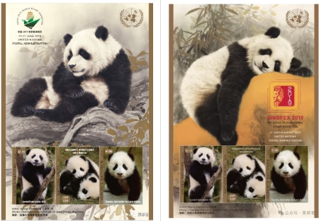 在中国2019年世界邮展和当年的新加坡邮展,联合国发行邮展事件小全张系列的《大熊猫》世界邮展小全张的两个版式!而这邮票的上的大熊猫来头不小,哥哥叫启启,弟弟叫点点,是一对双胞胎,它们是联合国的形象大使哦!