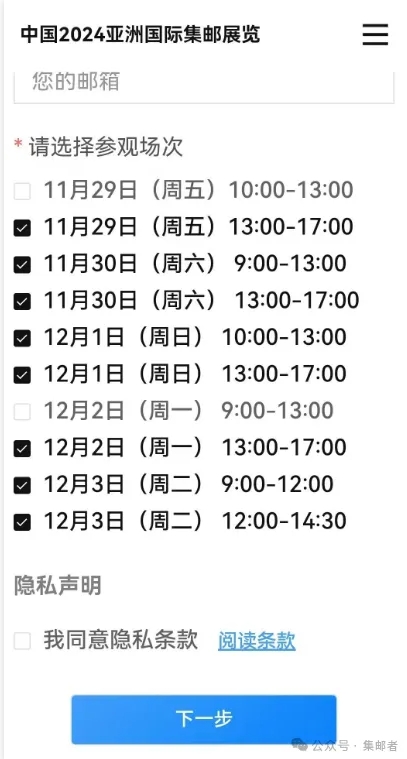 之前小集友情提醒过,本次亚展无需购买门票,但目前来看,还是要预约的。中国2024亚洲国际集邮展览的网页预约入口开启,参与的邮友可以开始预约了!