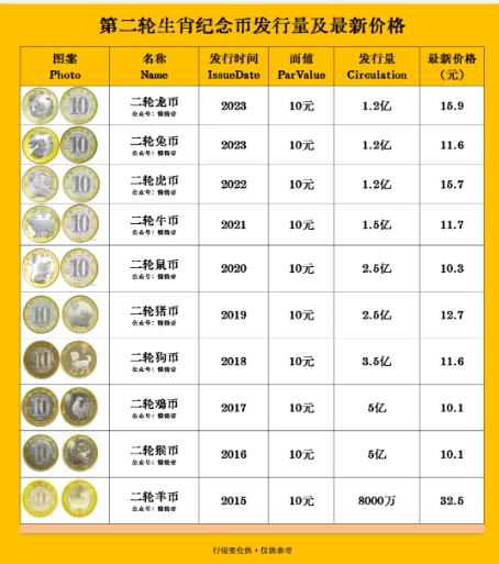 二轮生肖即将收官央行真正意义上的生肖币,其实是2015年开始发行,之前只能称为贺岁纪念币,因为二轮生肖币的主图才是生肖图案。