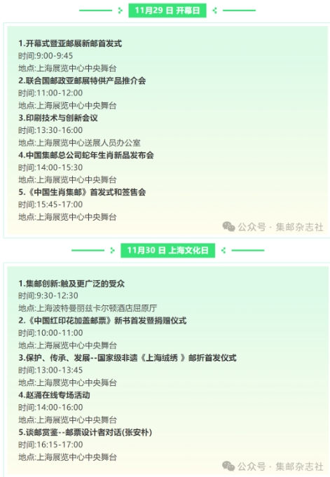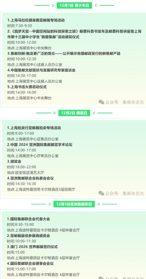 中国2024亚洲国际集邮展览每日活动 日期:2024-11-27 来源:集邮杂志社 中国2024亚洲国际集邮展览将于11月29日至12月3日在上海举办,每日开闭展时间如下。 本次邮展需要预约参观,预约详细可见21日“集邮杂志社”微信公众号《预约亚展门票攻略》文章(点击题目可跳转观看)。本届邮展历时5天,每天将有哪些活动呢?详情如下。