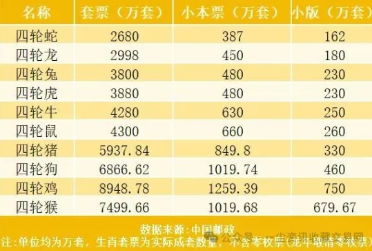 四轮生肖邮票发行数据而今年的四轮蛇邮票发行量,更是创造历史新低!与去年的四轮龙相比,四轮蛇的缩减量如下:四轮蛇套票减量:318万套;四轮蛇小本票减量:63万本;四轮蛇小版减量:18万本;总面值减少2030万。利好市场