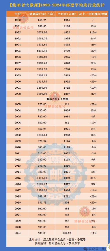 再看看1990-2024年平均发行量数据,不含生肖邮票的情况下,2024年的平均发行量已来到625.78万。因此2025年如果再减百万左右,平均量应该在500多万左右,个别票,如套票版张,低于500万也不是不可能。当里还要说一下,这里有一个重要的变量,就是零售量是否会增加?