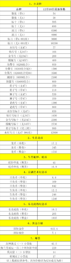 小龙钞、龙币、京剧币、东北虎豹币12月18日行情