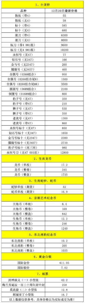 小龙钞、龙币、京剧币、东北虎豹币12月20日行情