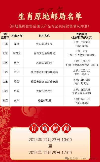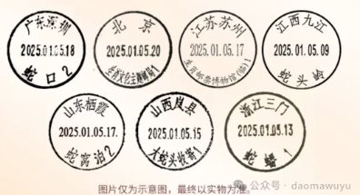 2024年邮政的发行计划基本完成,2025年第一枚邮票《乙巳年》的发行开始紧锣密鼓地布局了。中国邮政率先公布了《乙巳年》生肖原地邮局。全国一共有7所邮局入围,分别为广东深圳蛇口邮政支局、北京西城区生肖文化主题邮局、江苏苏州生肖邮票博物馆(临)、江西九江蛇头岭、山东烟台栖霞市蛇窝泊、山西吕梁大蛇头、浙江台州蛇蟠。