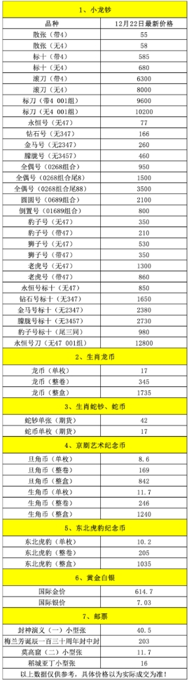 小龙钞、龙币、京剧币、东北虎豹币12月22日行情