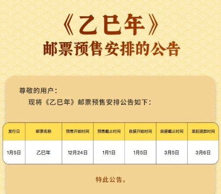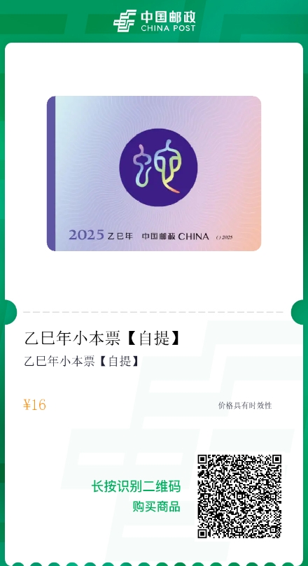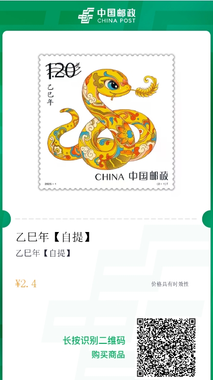 《乙巳年》邮票今日(24日)预售 日期:2024-12-24 中国邮政《乙巳年》邮票预售公告來了,将于12月24日上九时开始预售。 笔者将预售链接放在下面,喜欢的邮友可以关注: 生肖蛇套票预售二维码 生肖蛇小本票预售二维码