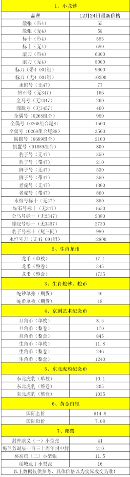 小龙钞、龙币、京剧币、东北虎豹币12月24日行情