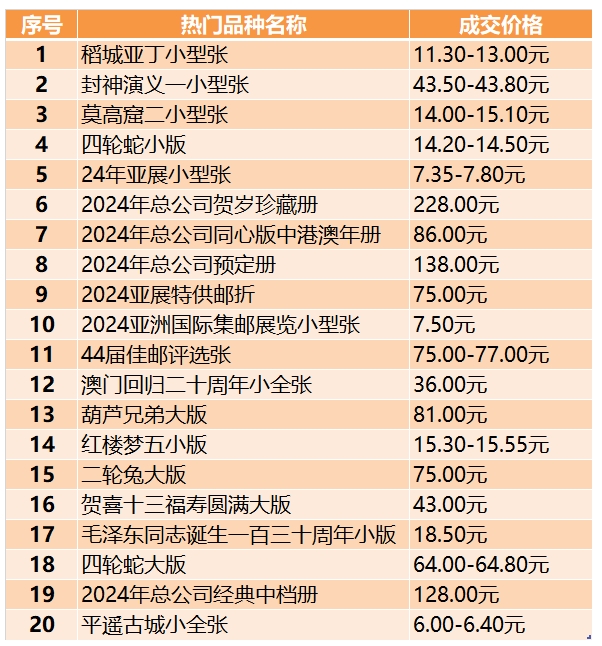 近期热销的邮票中,《2024年总公司贺岁珍藏册》以228元的成交价稳居市场之上,成交频次较高,显示出其较强的市场吸引力。