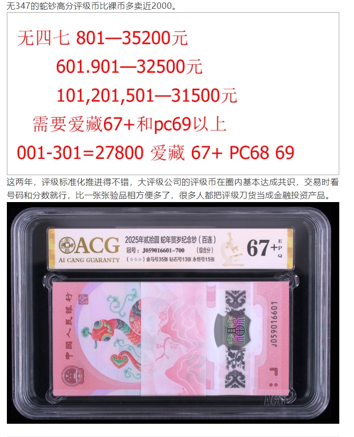 爱藏67分的评级蛇钞,比起裸币溢价1000多。