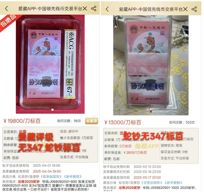 一般情况下评级刀货比裸币价格会高出20%左右,更好的靓号溢价就更多,同样是无347蛇钞标百,评级前售价在1.1万一刀,爱藏评级后的一般号码能卖到1.2~1.3万,能有一千到两千的涨幅,801组的靓号售价甚至可以达到1.98万一刀,溢价有50%!