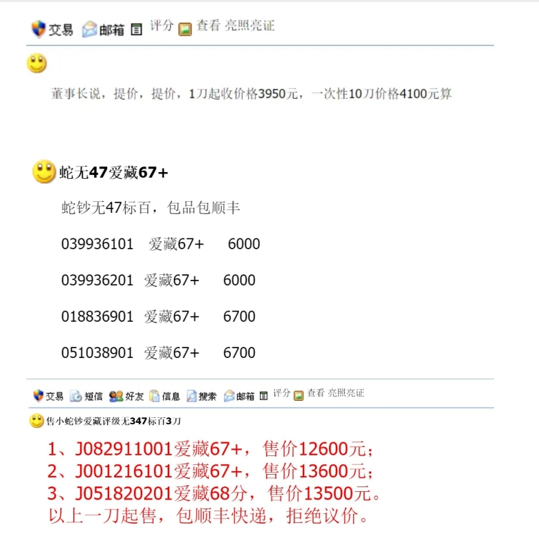 但无347、无47、无4的蛇钞百联收购价却一路飙升。无4刀货收购价已突破4000+,无47的更是6000元起步,无347的钻石号刀货市场价甚至到达了1.3万。