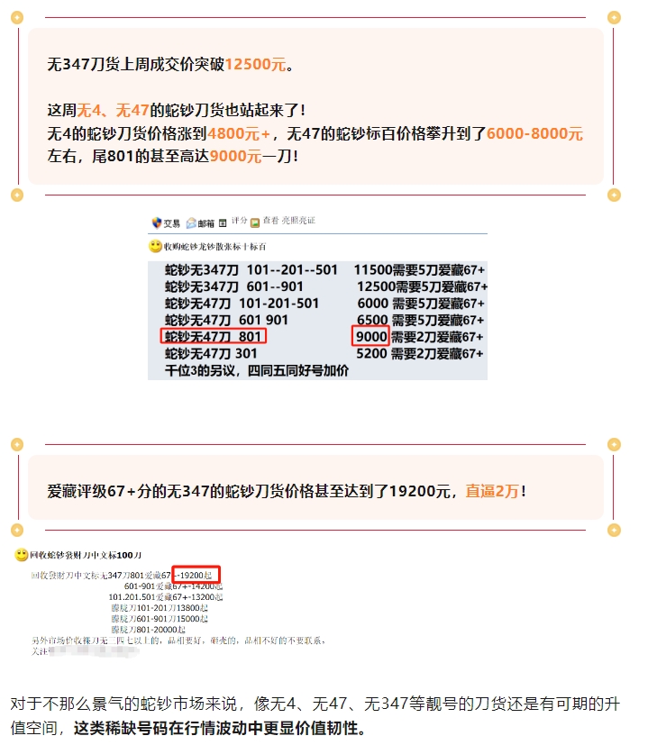 爱藏评级67+分的无347的蛇钞刀货价格甚至达到了19200元,直逼2万!