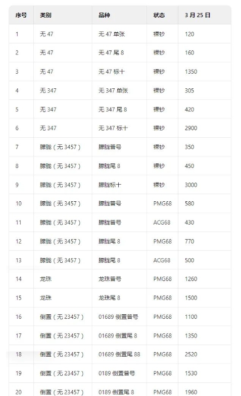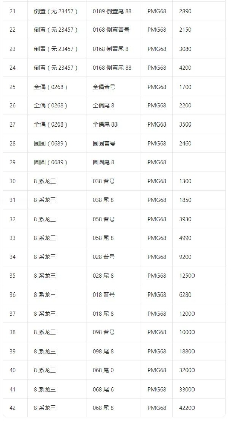 从表格来看,不同类别、品种和状态的龙钞价格差异较大。如无 47 单张裸钞为 120 元,而部分特殊品种如 068 尾 8 且 PMG68 评级的 8 系龙三价格高达 42200 元 。特殊号码(如尾 8、倒置号等)和经过权威机构评级(如 PMG68、ACG68 )的龙钞,价格普遍较高,反映出市场对品相和号码的看重。