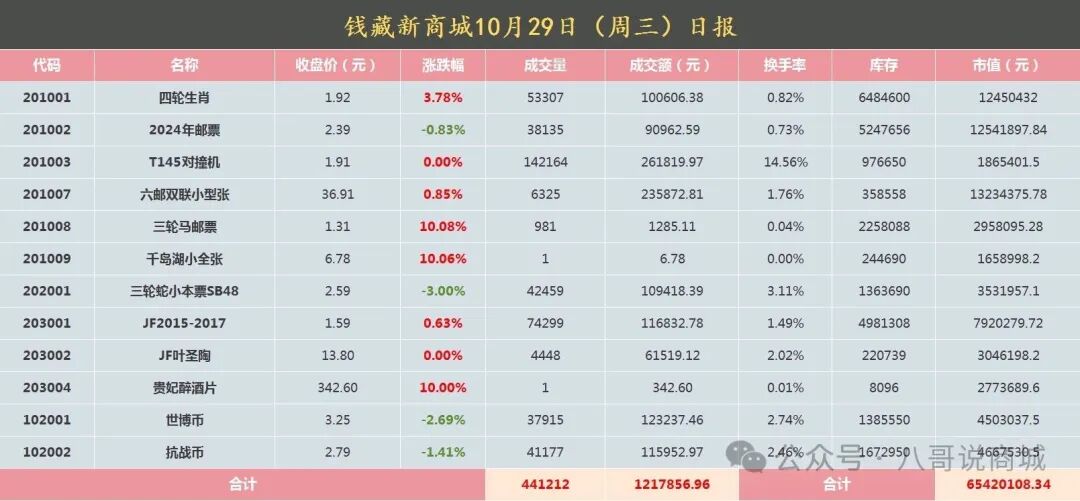 四轮生肖邮票(单枚),目前是离新高1.95元最近的品种,主力控盘度高,随时起飞的节奏,上市0.5元,今天开盘价1.85元,最高价1.93元,最低价1.8元,收盘价1.92元涨3.78%