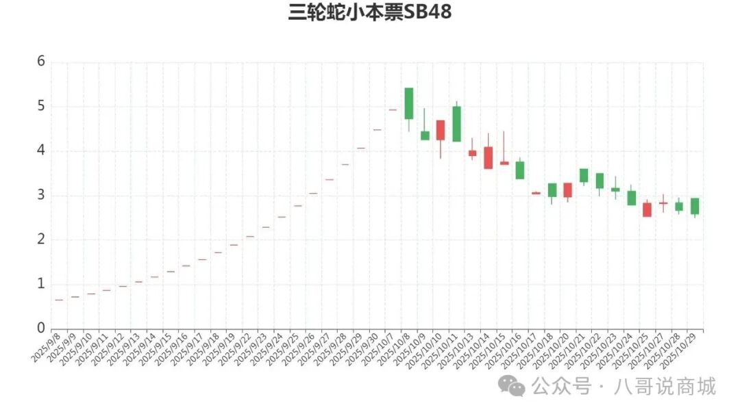 三轮蛇小本票单枚上市0.5元,今天开盘价2.94元,最高价2.94元,最低价2.5元,收盘价2.59元跌3%