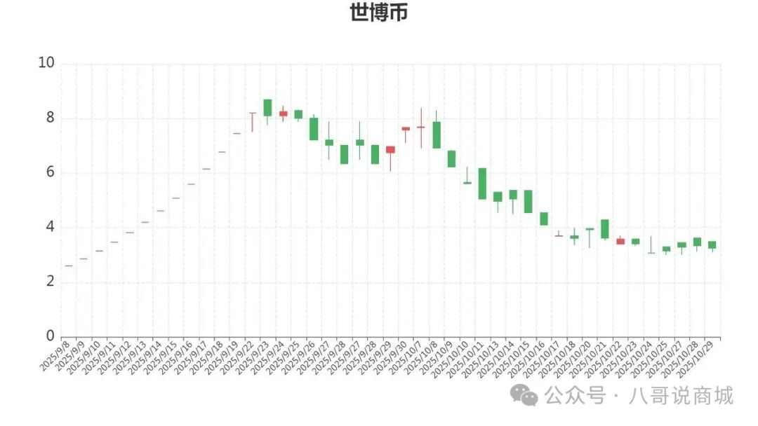 世博币,开盘价3.49元,最高3.49元,最低3.1元,收盘价3.25元,跌2.69%